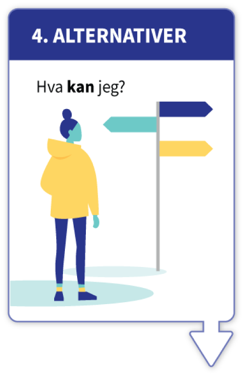De fleste etiske utfordringer og dilemmaer byr på ulike handlingsalternativer. Hvilke er disse? Det fjerde skrittet i refleksjonsmodellen handler om nettopp dette; kartlegging, sortering og identifisering av ulike alternativer for handling og valg.
