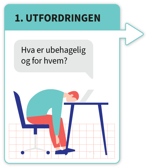 Det første skrittet i refleksjonsrunden er å ta stilling til den etiske utfordringen man står i, og å identifisere utfordringens karakter. Er det et dilemma, er det en annen type konflikt, eller utfordring? Hvem berøres av den? Dette kan være klargjørende. Å kunne gjenkjenne hver enkelt saks kjennetegn gjør at vi lettere lar være å handle etter vane (Lingås, 2019). Hva slags utfordring eller dilemma er det snakk om?